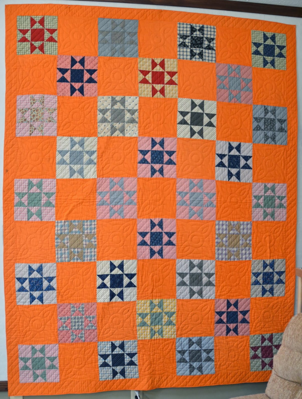 I paid so very little for it I almost feel I stole it. I couldn't even begin to buy the fabric to make one myself for that price. I'm sure the seller didn't think an orange quilt would appeal to many people, but beauty is in the eye of the beholder. Cheddar star quilts were popular throughout the 1800s. This is the simple style of quilt that really speaks to me and I think it is priceless. It is just the pop of color my quilt collection needed.